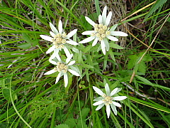 ミネウスユキソウ(キク科ウスユキソウ属)峰薄雪草 高山帯のやや乾燥した草地や礫地に生える。低山に生えるウスユキソウの高山型。高さ10cm。頭花は花茎の先にまとまって数個つける。八方池周辺に多い。アルプスのエーデルワイスはこのこと。でも大分違う。ミヤマウスユキソウがそれに似る。いずれも日本ではよく目に付くが、本場アルプスではほとんど見れない。僕はその何ヶ所か秘密の場所を知っている。 |